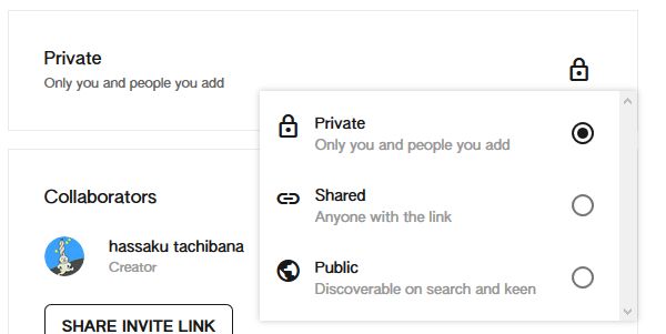 この時点ではこのKeenは非公開設定になっています。そこで下の「・・・」から「EDIT」へ。