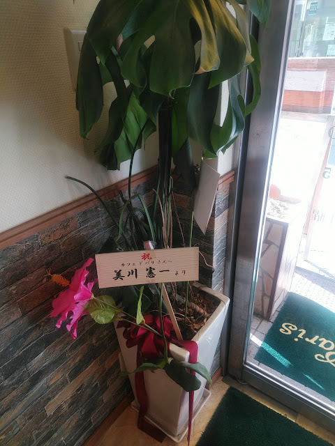 開店は2017年4月だということですが、入り口に今も美川憲一さんからのお花。