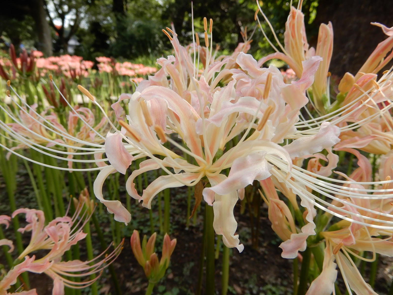 ほぼ満開の、赤、白、黄色、ピンクにほんのりピンクの曼殊沙華。