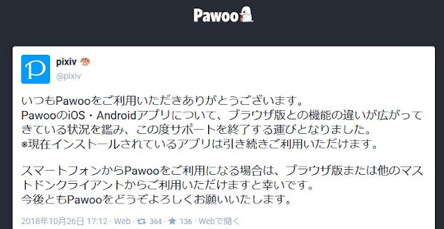 Pixivのmastodonインスタンス「Pawoo」のiOS/Androidアプリのサポートを終了するとのことです。