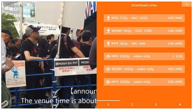 このボタンをクリックすると以下のように、映像とサウンドをダウンロード、映像のみを形式を選択してダウンロード、サウンドのみを形式を選択してダウンロードを選択できます。(下記画面にはサウンドのみは表示されていませんが、下の2,3,4を開くとその中に音声のみの場合も出てきます)
